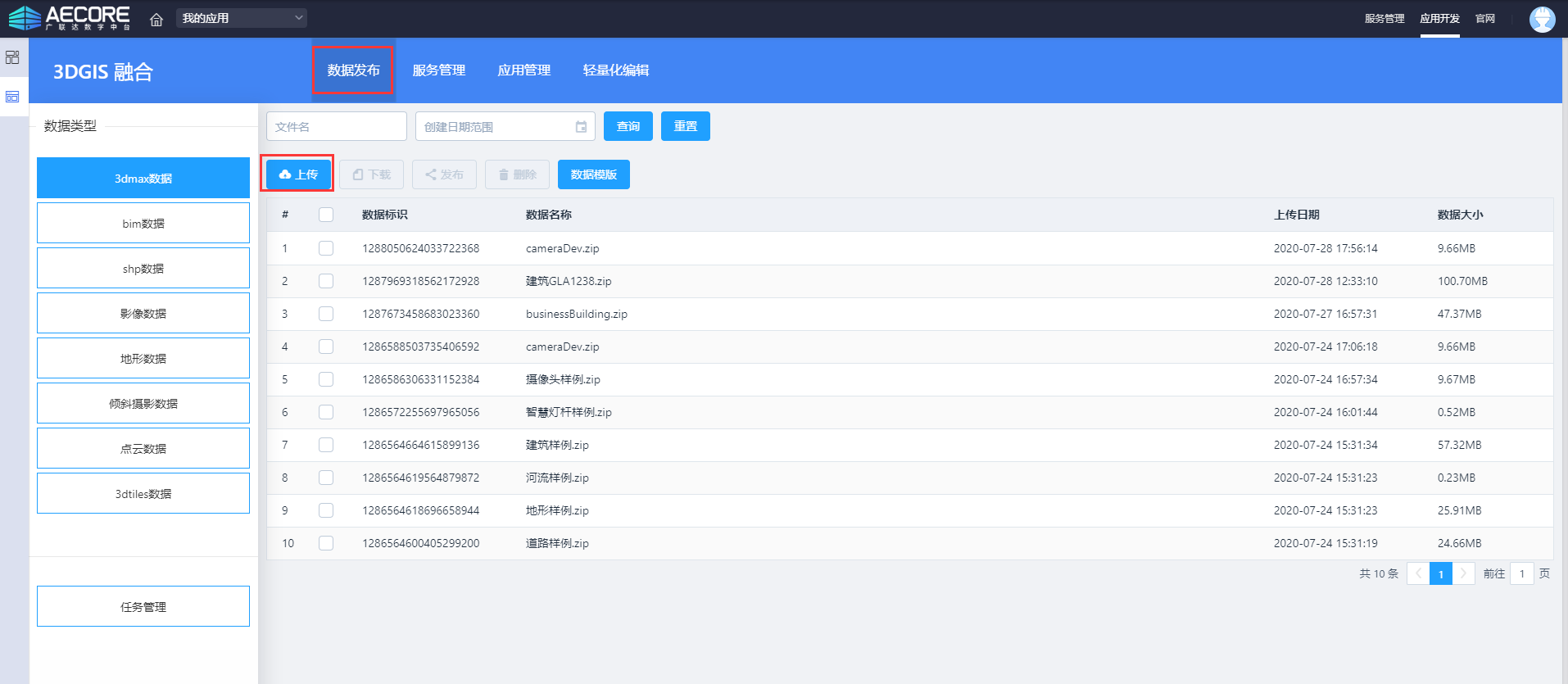 需求说明:上传园区的三维模型(建筑、地形、部件),发布后可在浏览器上预览园区三维场景