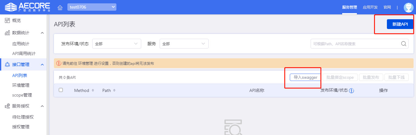 1)环境注册——创建服务环境。完成API类型信息提交后,系统默认进入到API管理-环境管理配置页