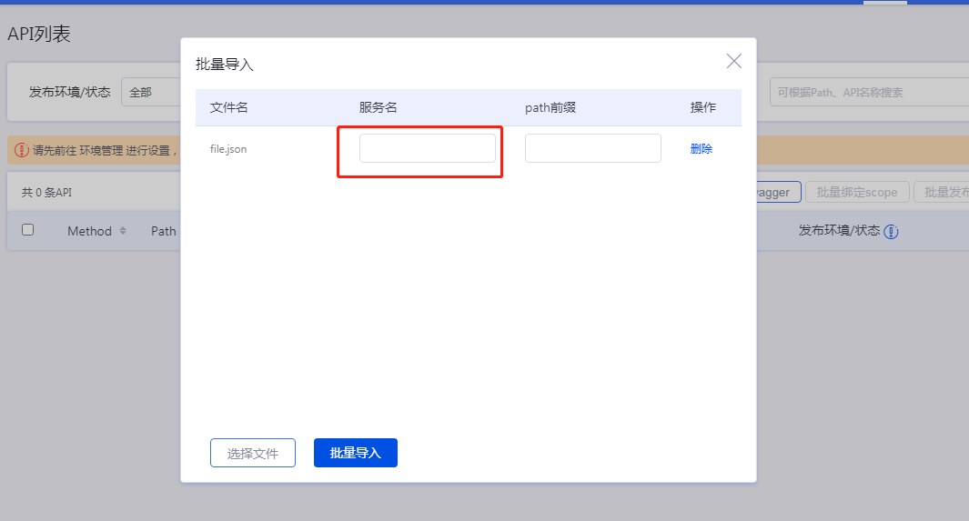 批量导入swagger,请填写对应的服务名称(尤其是在多微服务的情况下),以便于后期根据服务名称筛选API