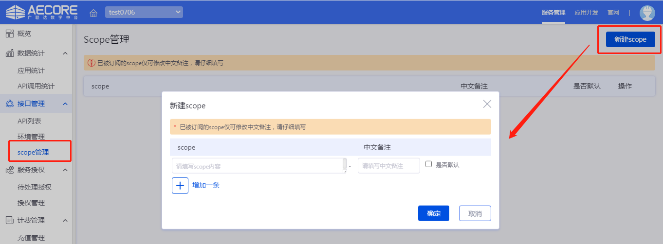 3)定义服务scope(选做,不定义scope即服务所有资源向订阅应用开放);