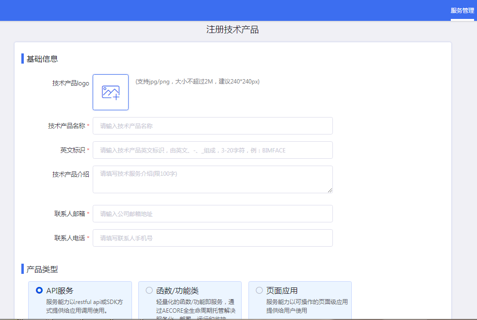 技术产品名称、英文标识(全局唯一,用于标识服务,请起有意义的名称)、技术产品简介、联系人邮箱与电话,选择服务类型(本节主要讲述API类型服务)
