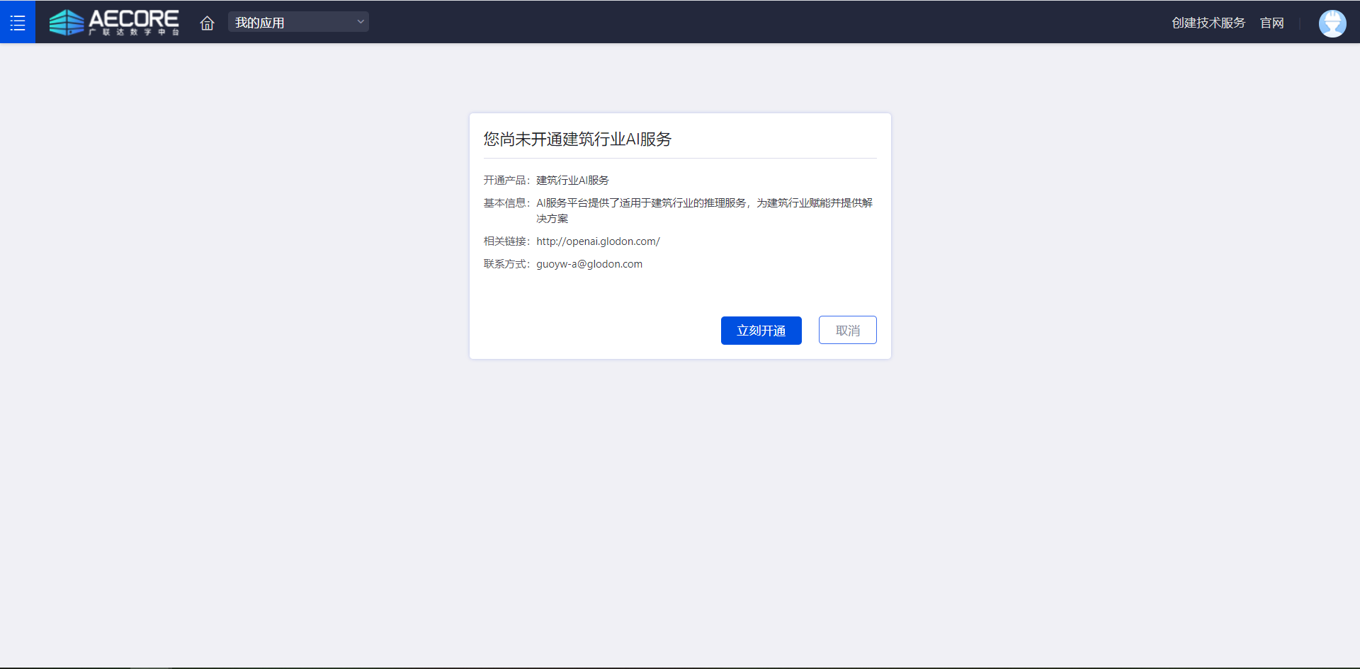 登录AECORE,并创建应用,创建应用后即可获取appkey、appsecret,这是调用服务的秘钥请妥善管理。