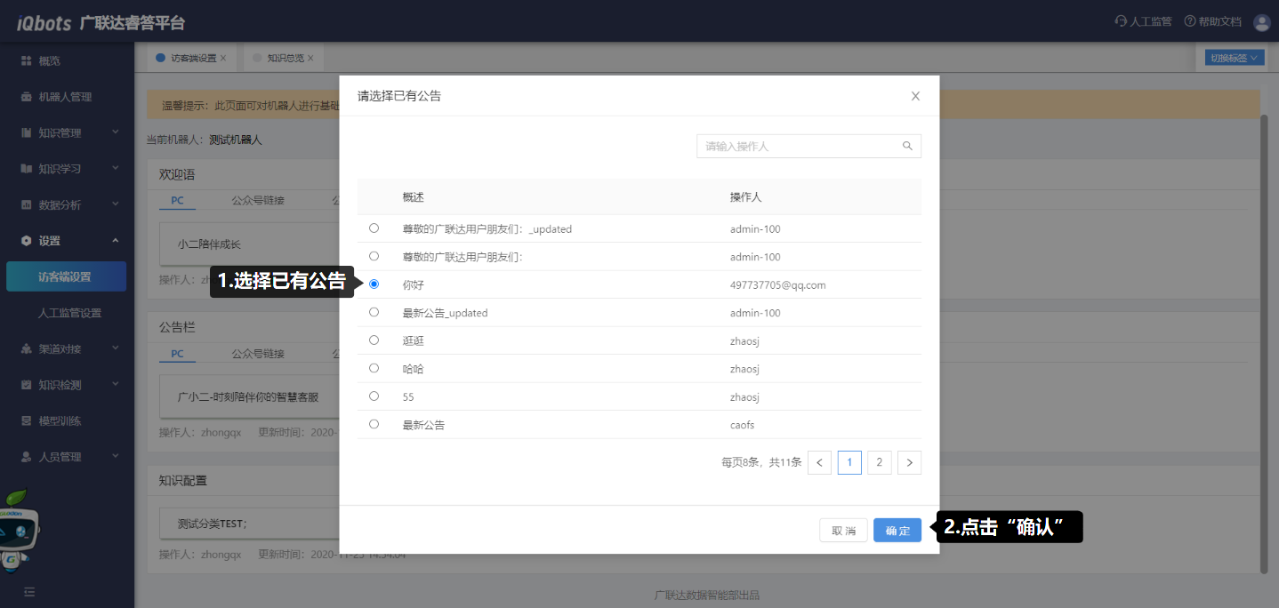 点击“设置”图标,可对当前机器人的欢迎语文案、公告栏文案、知识配置进行添加或修改。其中,欢迎语和公告栏都有两种配置方式:一种是在现有文案上进行修改;一种是选择已有欢迎语直接进行配置。