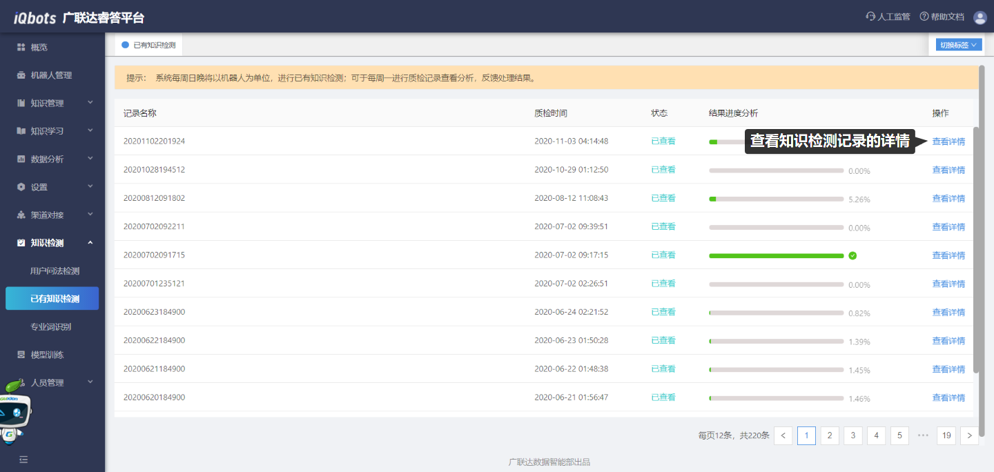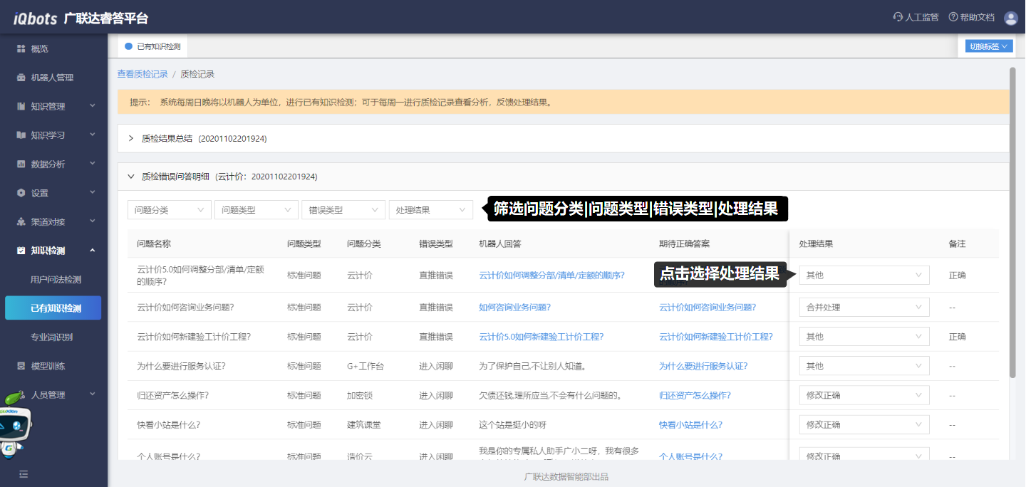 该模块是系统每周日以机器人为单位,对已有知识进行检测后的结果汇总列表。在该模块中可以查看质检的记录和详情信息,包括质检时间、状态、结果进度分析和质检详细分析结果,并在错误问题详情中反馈处理结果,如删除/合并问题。