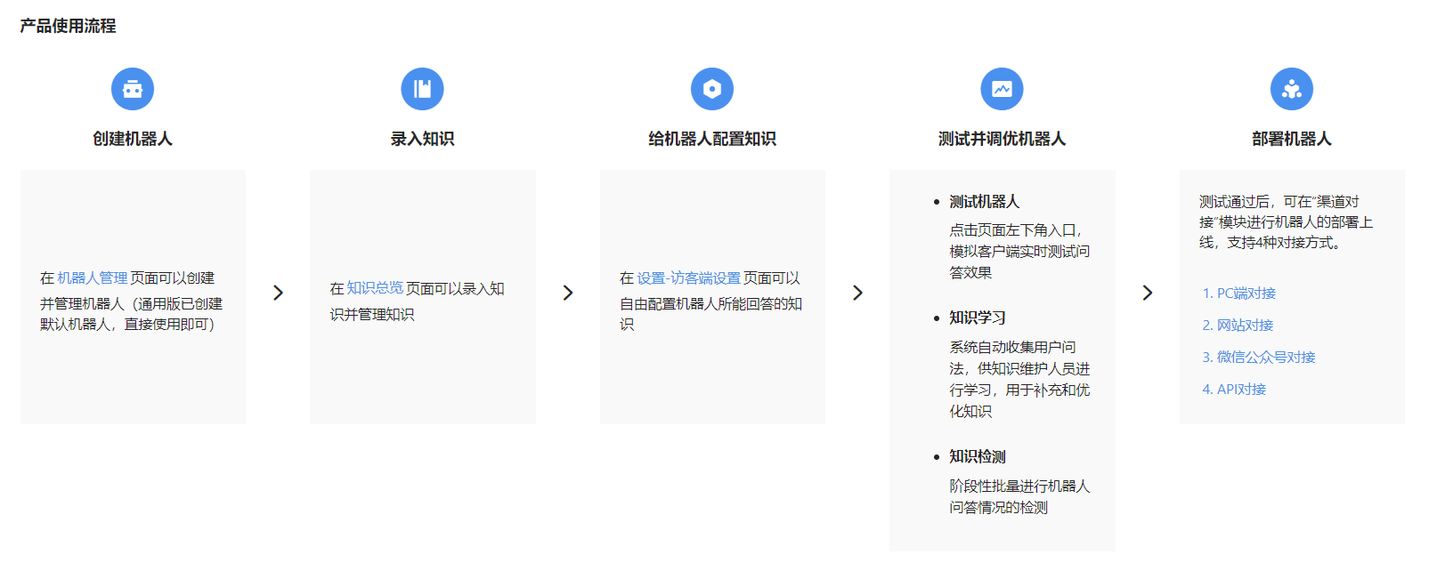 完整的对话机器人应用分为控制台和机器人入口终端两部分。首先业务方需在控制台进行机器人的创建以及知识配置,然后再将机器人接入终端,为业务的终端用户提供咨询入口,从而完成一次智能对话。整个过程分为以下几步: