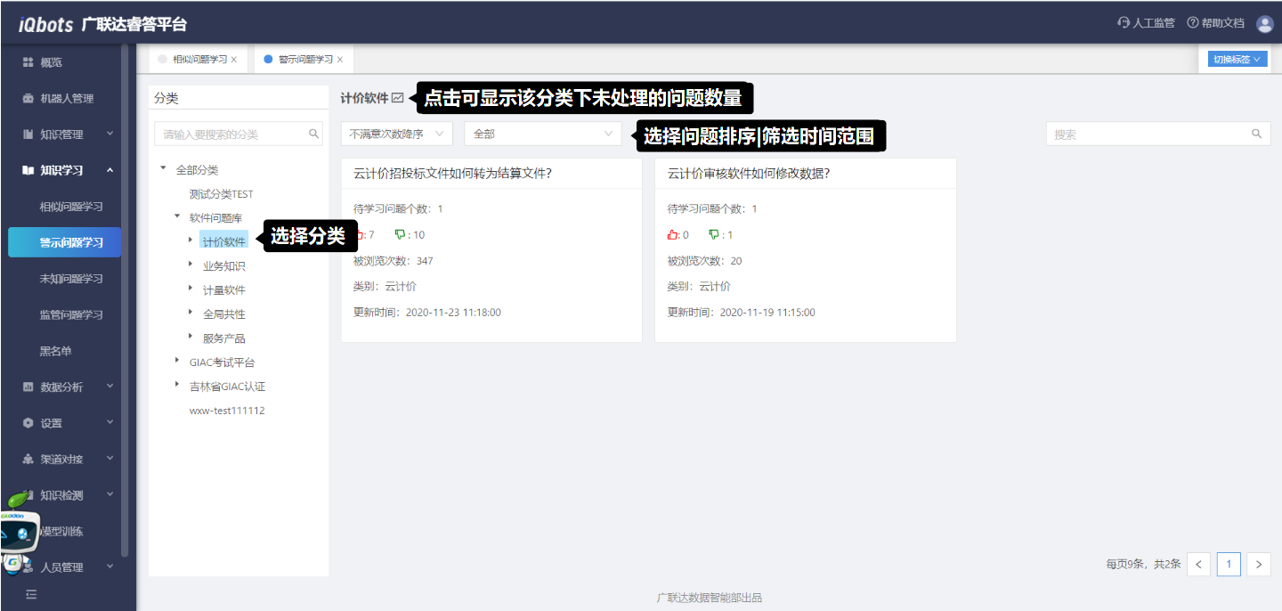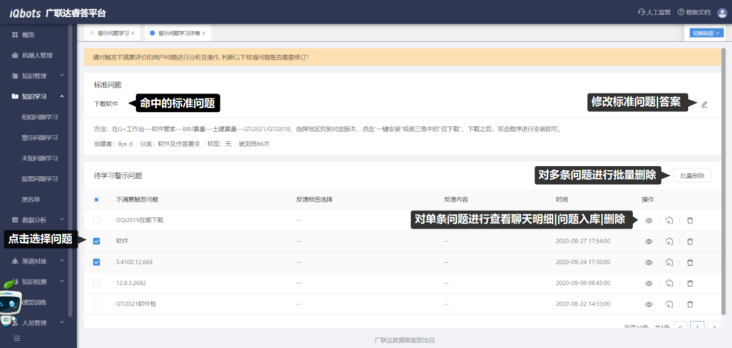 警示问题学习模块是被用户“点踩”的问题汇总,用于判断用户点踩的原因,进而完善相应的知识。