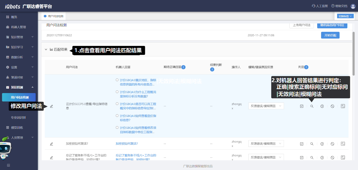 对用户问法的匹配结果进行判定:用户问法检测后,点击“匹配结果”,查看用户问法的检测结果列表;在每条问题后都可以去判定机器人回答的结果是否正确。判定类型包括:正确、正确标问、无对应标问、无效问法和模糊问法;模糊问法包括直推正确、直推错误、引导正确、引导错误四种可选的问答结果,根据机器人回复的实际情况去选择结果。