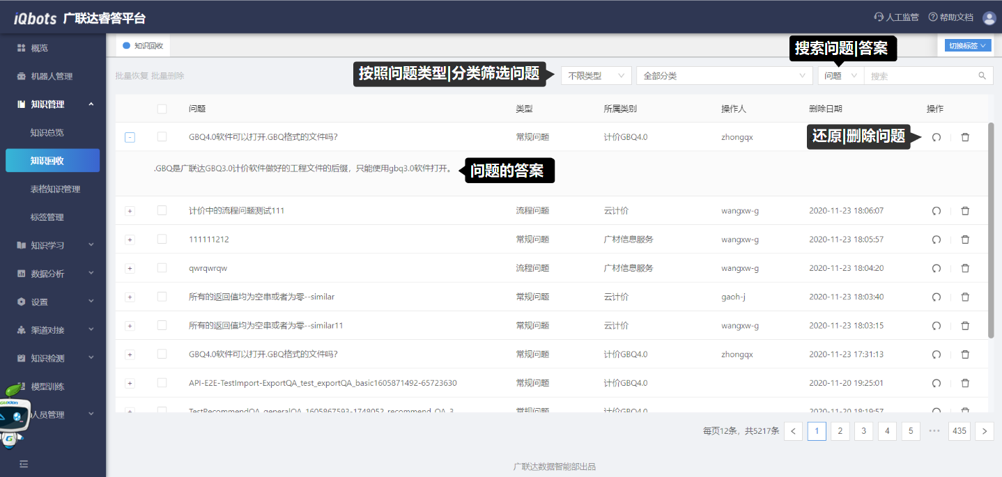 知识回收页面可实现对已删除问题的还原和删除操作。点击还原问题后,该问题会恢复为知识库内的标准问题;点击删除,该问题将被彻底删除。