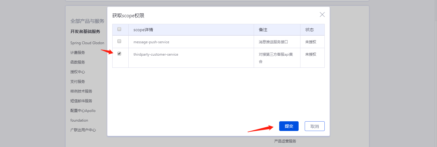 应用创建后选择并开通本服务,申请应用scope