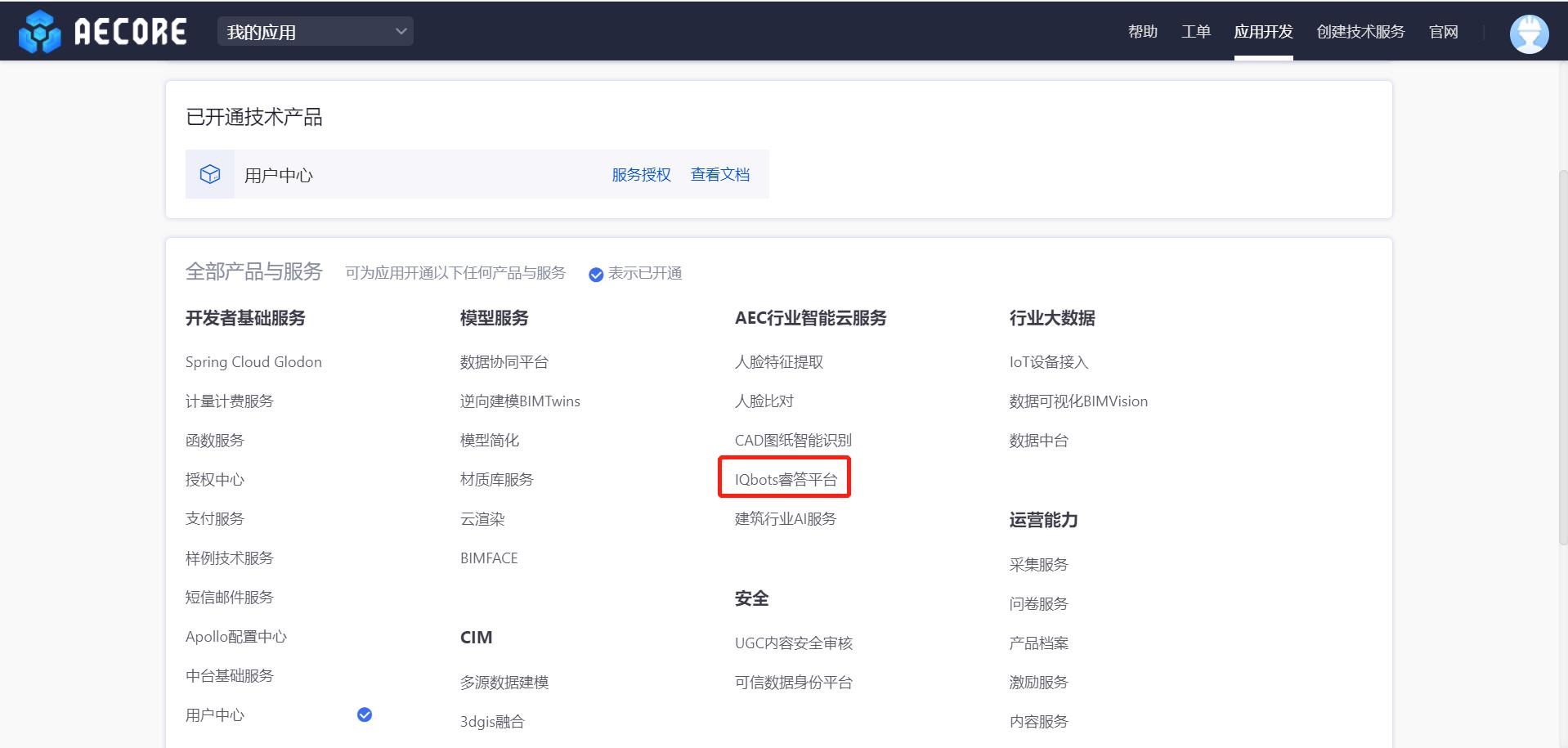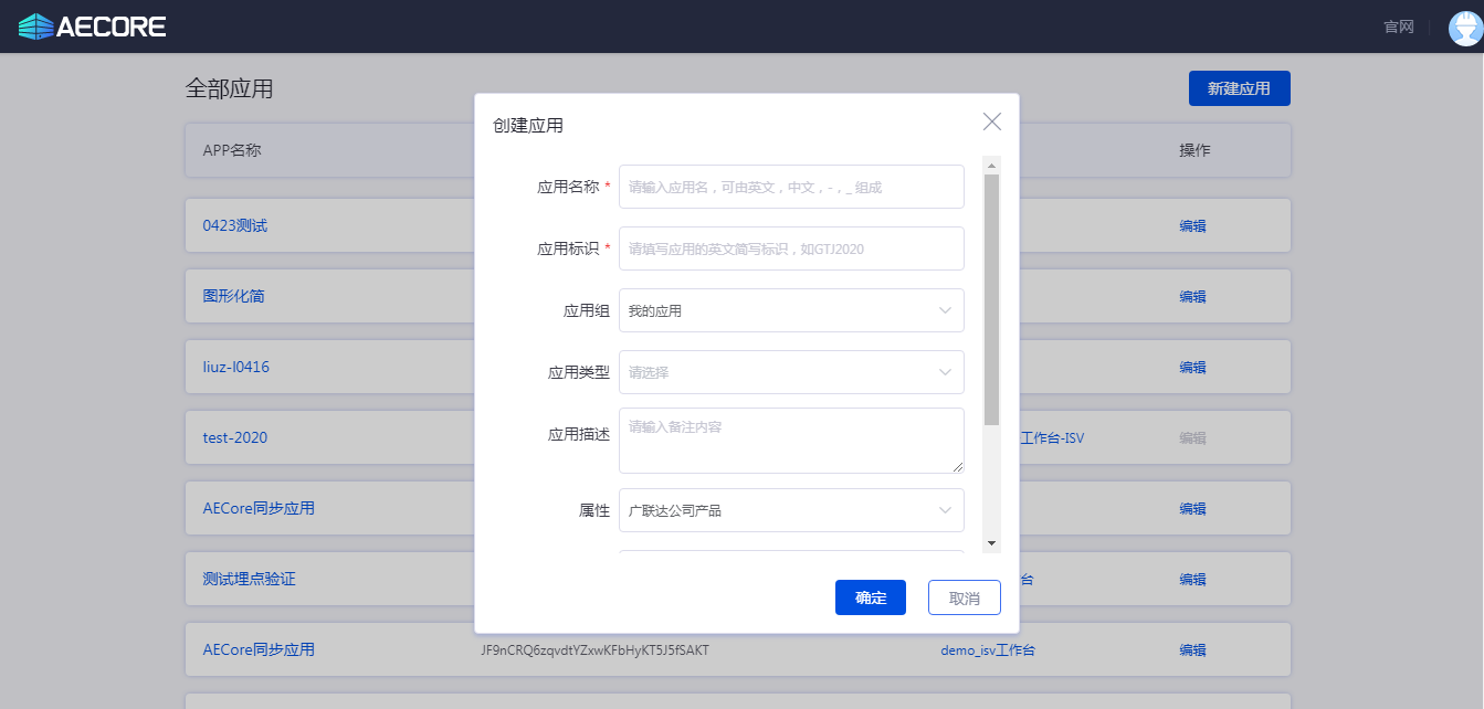 登录AECORE,并创建应用,创建应用后即可获取appkey、appsecret,这是调用服务的秘钥请妥善管理。