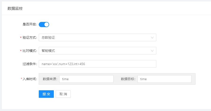 数据监控主要从以下两个角度对任务数据进行比对,一是通过数据来源的入库时间字段与导入(同步)数据目标的对应时间类型字段进行比对,统计规定时间范围内两个数据源的数据总条数是否一致,从而达成验证效果,即总数验证;