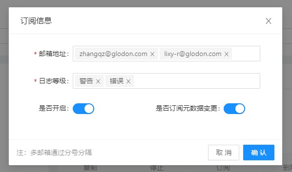 根据任务日志内容的四个等级(详见7.2任务日志),我们可以对接收邮件的内容进行选择,以及可以选择是否订阅数据来源的元数据变更信息。