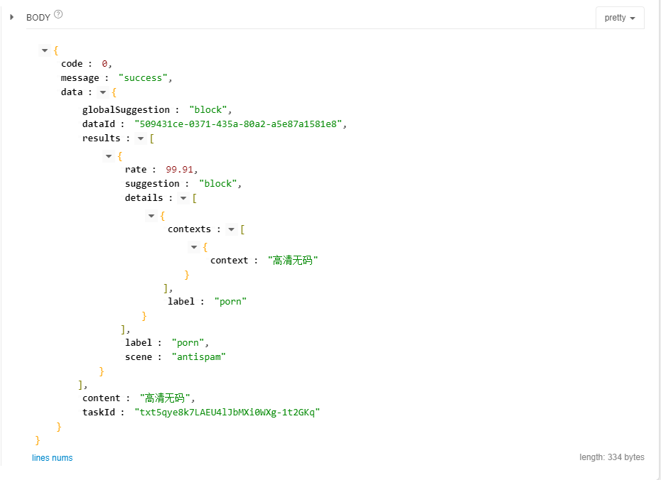 | globalSuggestion | 字符串 | 是 | 本次检测结果,取值: pass:文本正常,可以直接放行 review:文本需要进一步人工审核(只要有一个suggestion为review,即为review) block:文本违规,可以直接删除或者限制公开(只要有一个suggestion为block,即为block) |