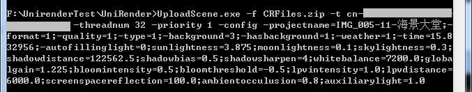 UploadScene.exe -f CRFiles.zip -t cn-XXXXX-XXXX-XXXX-XXXX-XXXXXX -threadnum 32 -priority 1 -config -projectname=IMG_005-11-海景大堂;-format=1;-quality=1;-type=1;-background=3;-hasbackground=1;-weather=1;-time=15.832956;-autofillinglight=0;sunlightness=3.875;moonlightness=0.1;skylightness=0.3;shadowdistance=122562.5;shadowbias=0.5;shadowsharpen=4;whitebalance=7200.0;globalgain=1.225;bloomintensity=0.5;bloomthreshold=-0.5;lpvintensity=1.0;lpvdistance=6000.0;screenspacereflection=100.0;ambientocculusion=0.8;auxiliarylight=1.0