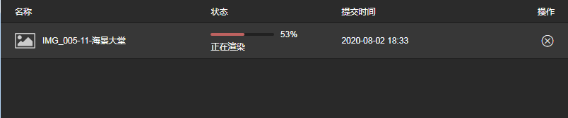 实时查看渲染任务后台进度,不是云渲染核心流程中的必要步骤。因此我们暂时不针对demo用户,提供可视化页面查看任务。下图展示的是BIMDECO产品渲染任务管理页面,是业务产品基于云渲染服务API和自身业务需要,开发的前端页面。当业务产品集成云渲染时,可根据实际需要定制化开发相关页面风格和功能。