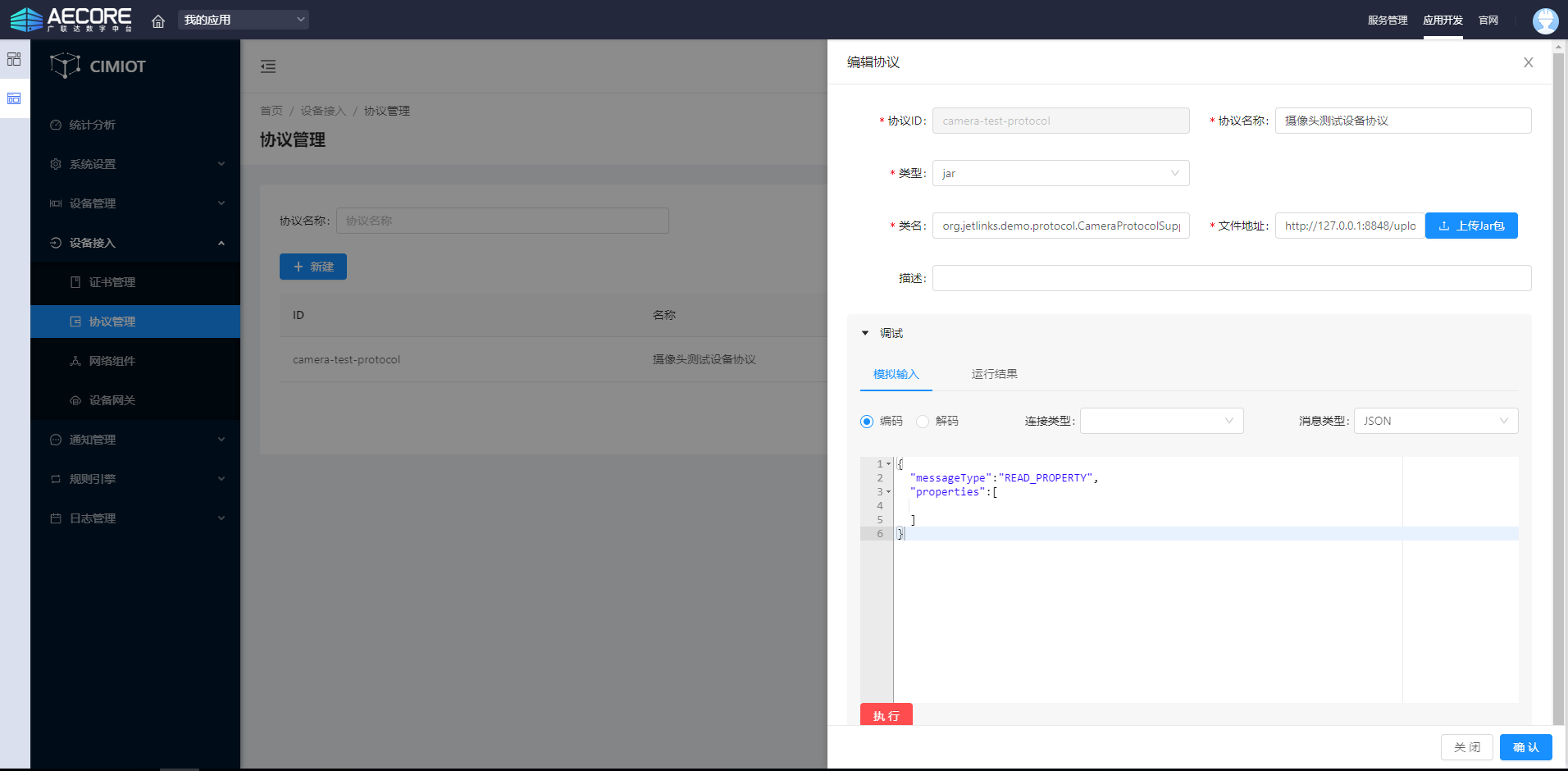 协议是设备与平台通信的一种标准,某个设备想与平台进行通信就必须按照某种协议标准进行规定上报的数据格式。协议管理将提供两类协议类型:jar包形式,脚本形式。定义了这两类中的其中一种,即完成了协议管理的定义。