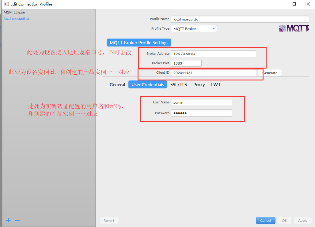 【client ID】为设备实例id,必须和步骤三创建的设备实例一一对应。