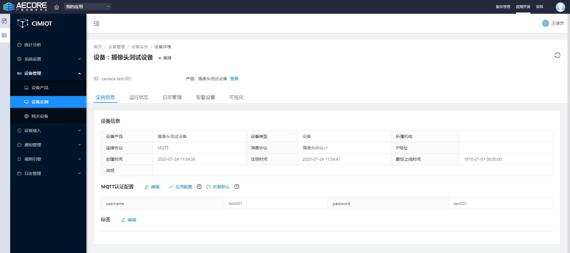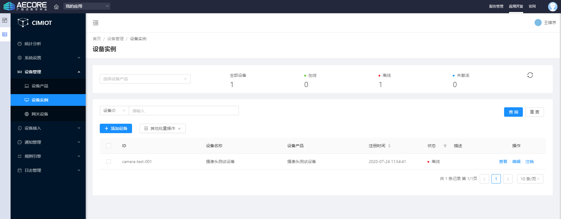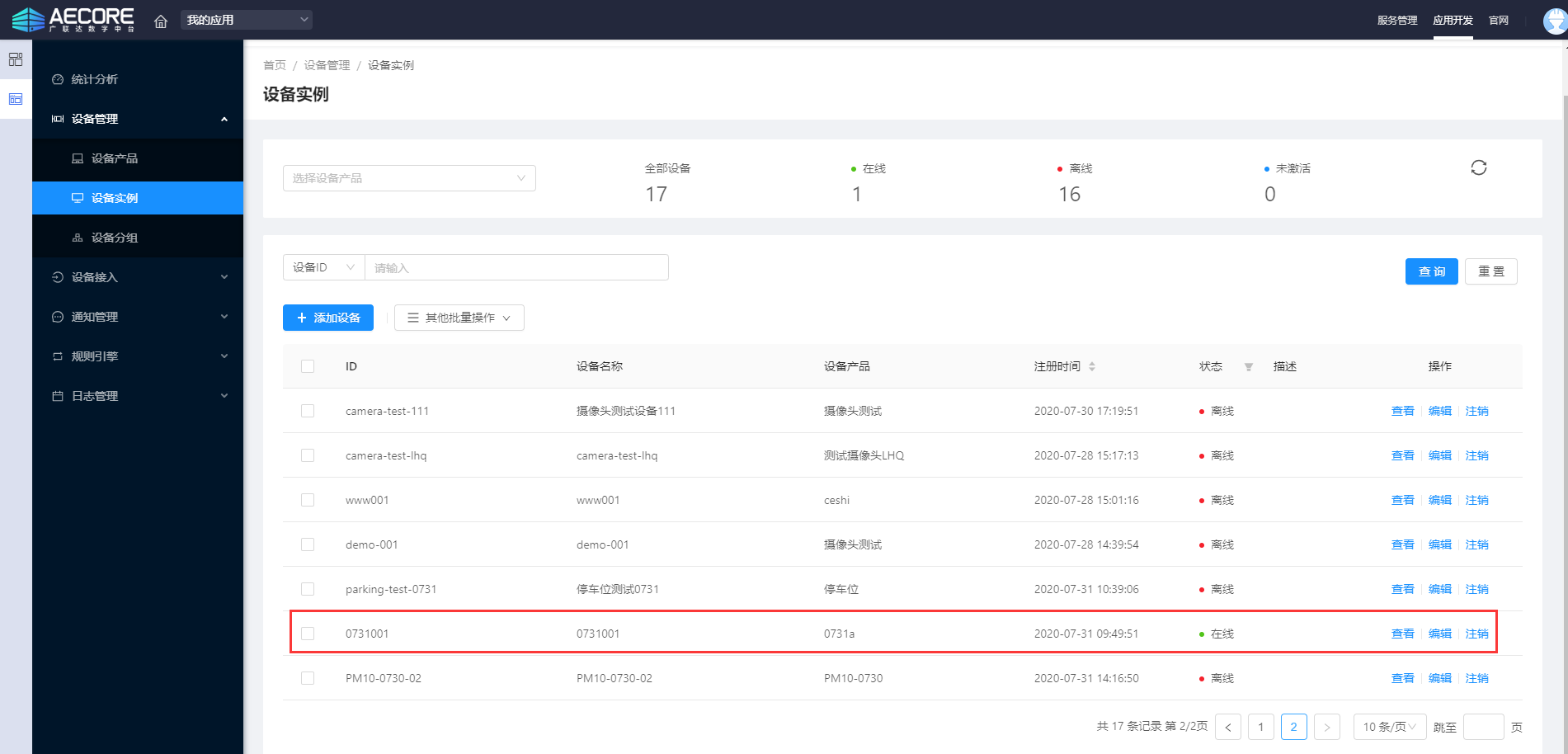 同时,返回物联网设备接入平台,刷新该设备,设备状态会由【离线】变为【在线】,如下图: