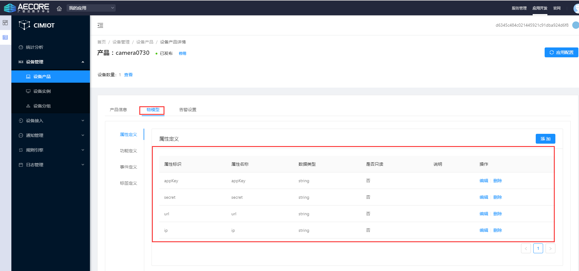弹出设备产品详情信息,切换到【物模型】页面,进行模型属性字段的添加。