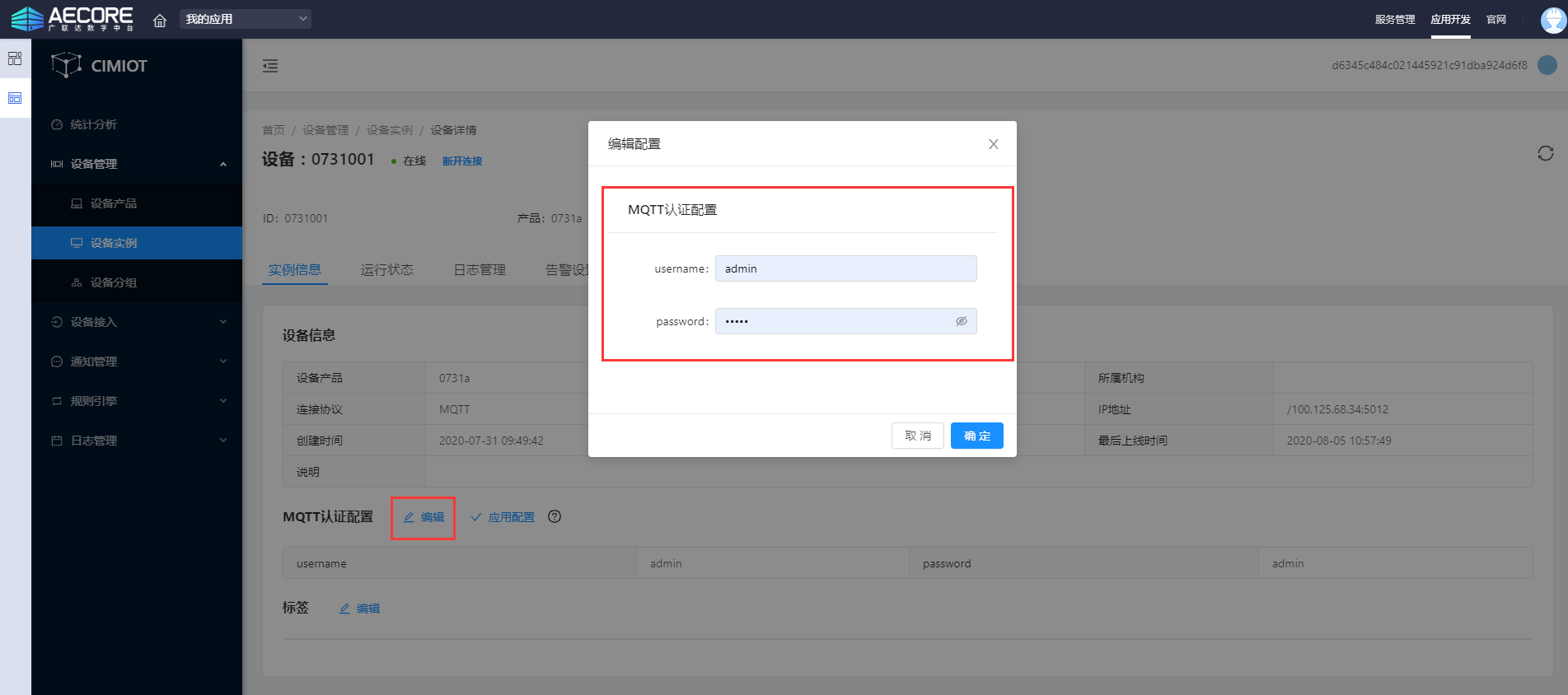 为 设备实例添加认证配置,如下图;