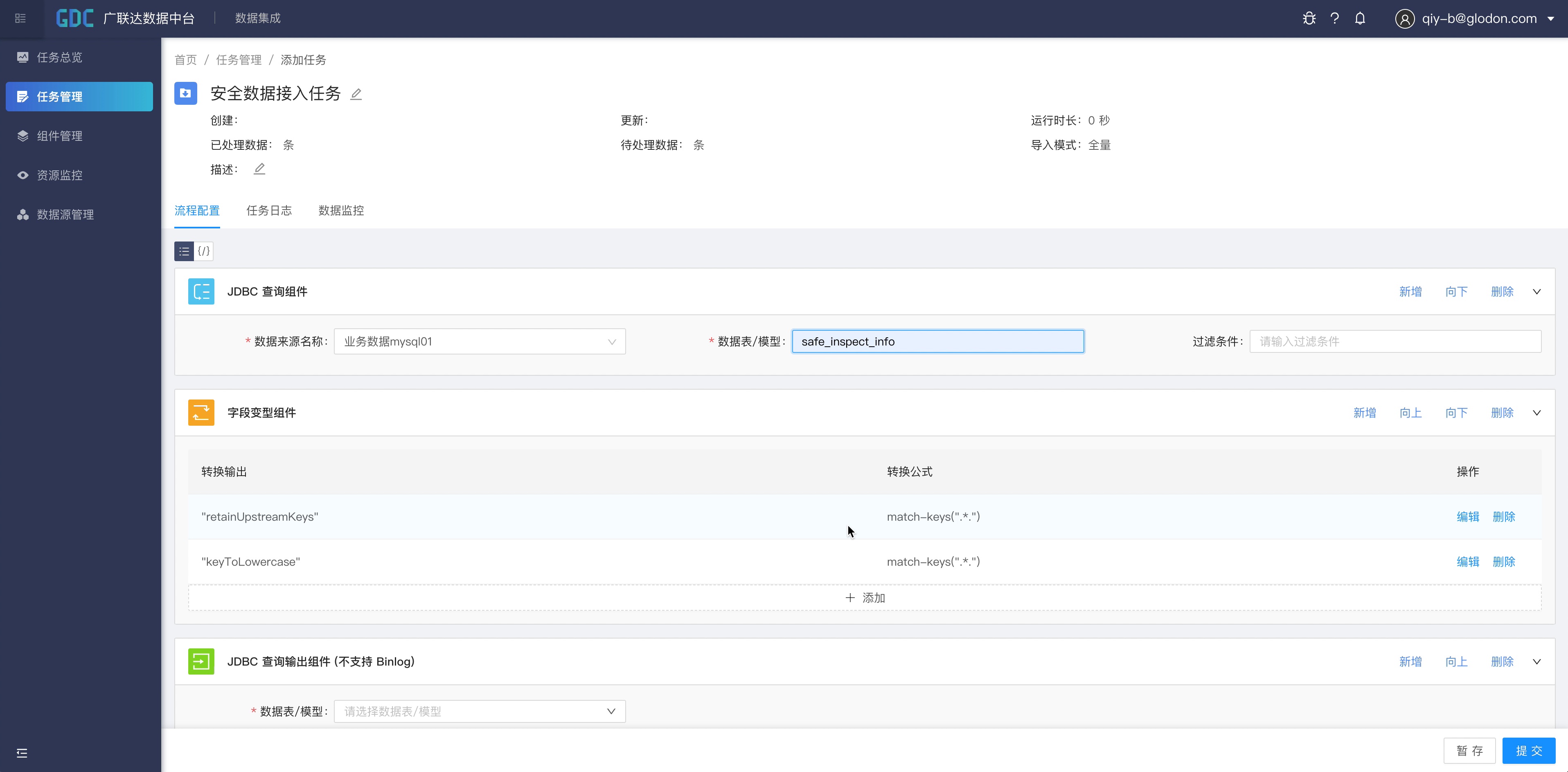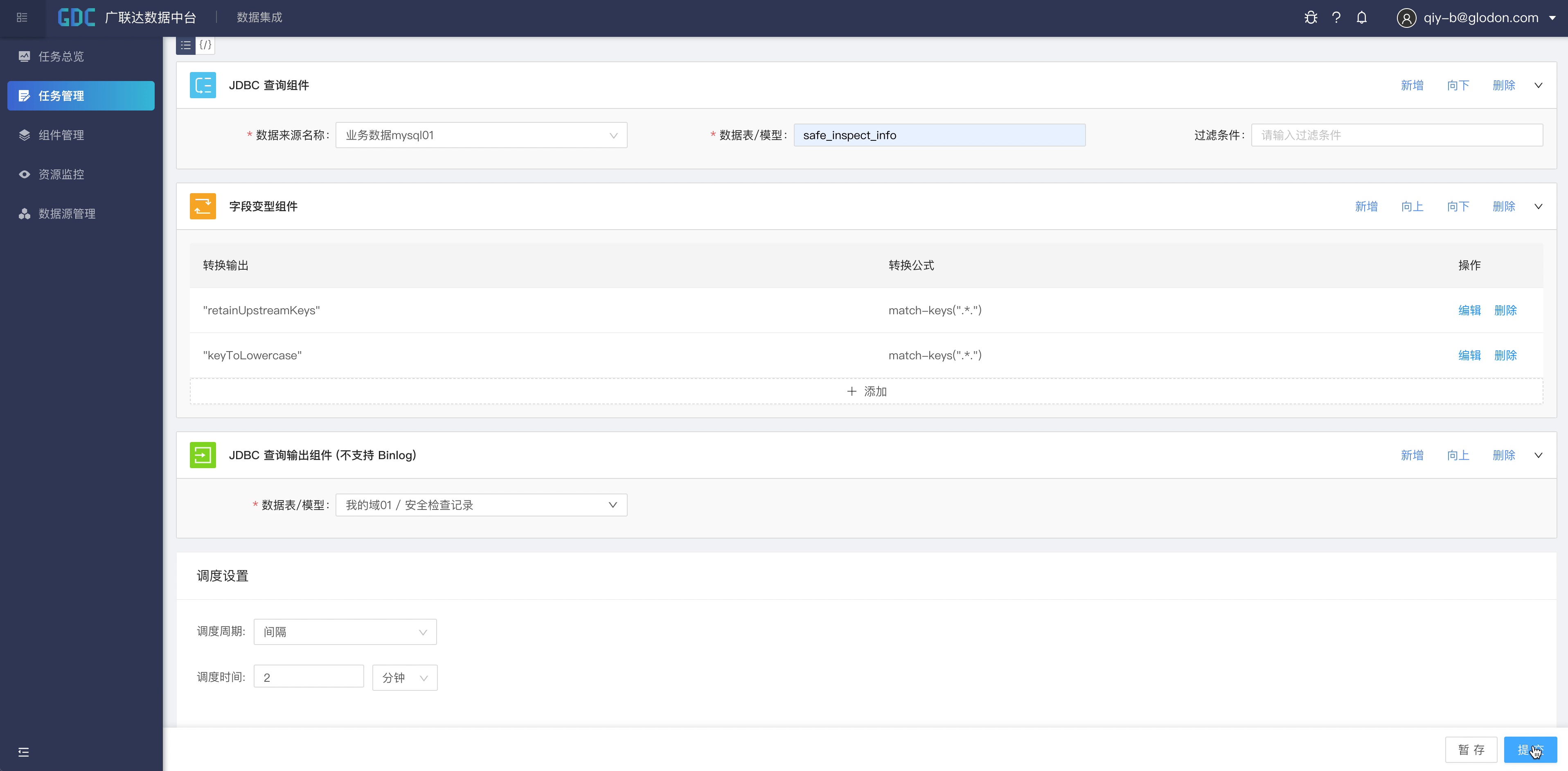 在最后的输出组件里我们选择在前面步骤创建好的域下面的数据模型“我的域01/安全检查记录”,配置好调度周期后,点击“提交”,我们就完成了第一个集成任务的创建。