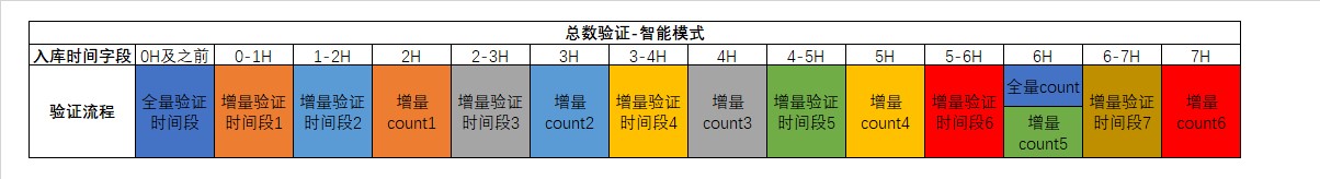 全量模式示意图见Fig 10,其中0H代表验证开始(整时),相同颜色代表一组需要全量验证的时间段和验证执行的时间,每一小时更新一次需要全量验证的时间段,在六小时后对数据目标中需要时间段对应的数据进行count计数,并与数据来源进行验证。