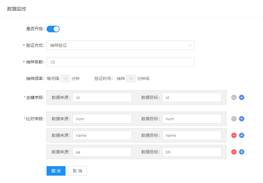 抽样验证方式需要配置如下内容:抽样条数、主键字段和比对字段。