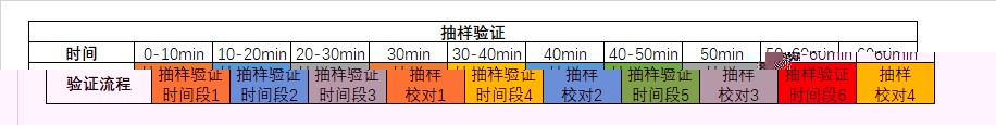 抽样验证的示意图见Fig 12,其中0min代表验证开始(整十分钟),相同颜色代表一组需要抽样比对的时间段和比对执行的时间,每10分钟进行一次抽样,在30分钟后跟据抽样数据的主键值在数据目标中进行查找,并根据数据来源与数据目标中抽样数据的比对字段的值进行验证。