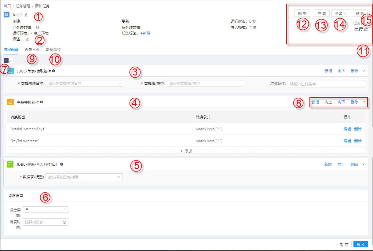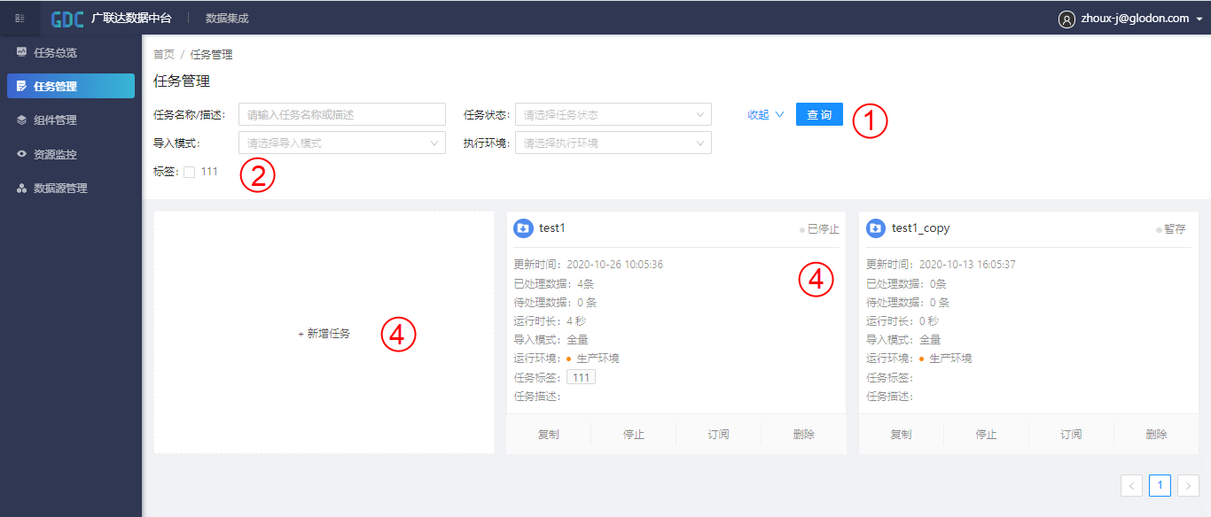 ① 任务管理的搜索栏,可根据任务流程名称和描述中包含的字符、任务状态、导入模式及执行环境对任务流程进行搜索,任务状态包括暂存、未开始、运行中、已暂停和已停止;导入模式包括增量和全量;执行环境目前只包括生产环境一个选项;